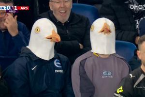 体育资讯03月05日讯 英超第29轮,阿森纳客战布莱顿,看台上出现两位球迷带着海鸥头套。