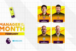 体育资讯03月05日讯 英超官方公布了2月最佳主教练奖的候选,安德鲁斯、卡里克、瓜迪奥拉、斯洛特入选,阿尔特塔未能入选。
