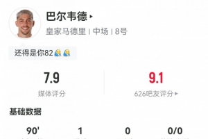 体育资讯3月7日讯 本轮西甲,皇马2-1客场绝杀塞尔塔。此役巴尔韦德首发打满全场打进绝杀进球,球员全场重点数据如下↓