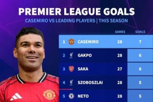 体育资讯3月16日讯 英超第30轮比赛,卡塞米罗破门,曼联主场3-1击败维拉。德国转会市场统计了卡塞米罗与部分顶级球员本赛季英超的进球数量。