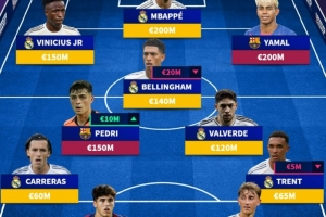 中场:佩德里(巴萨,1.5亿欧)、贝林厄姆(皇马,1.4亿欧)、巴尔韦德(皇马,1.2亿欧)