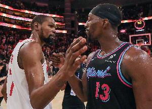 WNBA球星、热火球员阿德巴约女友阿贾·威尔逊在接受采访时谈到了此事:“我一直都很钦佩杜兰特。显然,我是来这里支持热火队的,但我非常欣赏KD的职业精神。每当涉及女子篮球领域时,他总是对我们这一侧的篮球运动表现出极大的支持与关爱。因此,能亲临现场见证他拿下这些得分,依然是一件非常美好的事情。尽管这发生在他对阵我男朋友的比赛中,从这个角度看确实让人有些‘心碎’。